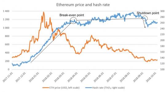However, the bear market didn’t come to an end. The reason for this was that miners aren’t the only sellers, and sellers still had an advantage over buyers and kept pushing the price curve down. The next major standing was lost in early September when the price dropped from 300 to around 200 dollars over the course of a few days. For some miners, this was too much to handle. The mined ether was no longer enough to cover their electricity bills, so there was no sense in continuing the mining and they shut down their devices. This was clearly mirrored in the hash rate of the network, which reduced by approx. 10% directly after the fatal drop in price. Less effective miners ceased production after their income was unable to recover even their variable costs. This is referred to as the shutdown point.
