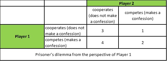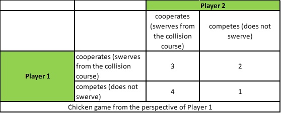 The possible outcomes of the chicken game and the prisoner’s dilemma are summarized in the table below from the perspective of Player 1. Outcome 1 is the worst, and outcome 4 is the best possible scenario. Cooperation means cooperation with the other player, not with the police. It is obvious that the worst possible outcome is when I cooperate (do not make a confession) and the other prisoner competes (makes a confession), as in this case only I’ll have to suffer the consequences (10 years in prison). In the chicken game however, the worst-case scenario is when we both compete (do not swerve from the collision course), as we’ll both end up dead.