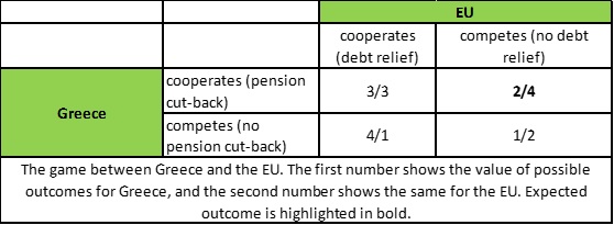 The worst outcome for the EU is to cooperate, while Greece refuses to do so, i.e. they refuse to cut back on pensions. This way, the EU would face a mass of claims from other peripheral member states. The logic behind this is simple: if the Greek were allowed to do it, everybody should be allowed. Extremist parties like Podemos in Spain would gain further momentum, since this outcome would prove that Syriza was right when choosing the collision course: painful measures can be avoided altogether, debts need not be repaid, and the EU can go and screw themselves.