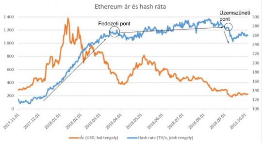 Valamikor márciusban érkezett el az a pont, amikor a hash ráta növekedése megállt. A hatalmas árzuhanás ellenére a bányászok éter keresete még mindig bőven fedezte a villanyszámlájukat. De abban már nem bíztak, hogy további bányászgépek tőkeköltségét is ki tudják termelni, ezért leálltak azok telepítésével. A meglévőket azonban pörgették tovább. A gazdaságtanban ezt hívják fedezeti pontnak.