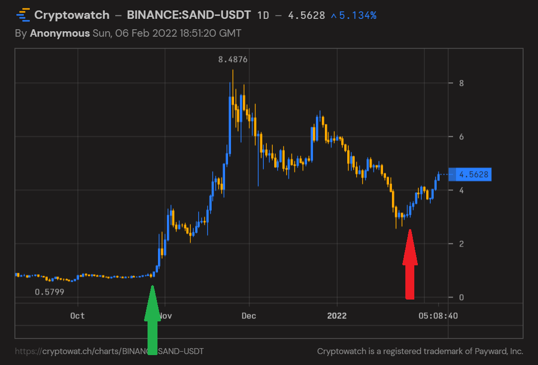 A grafikonra nézve láthatjuk, hogy nem először indult meg alaposabban e token ára. Tavaly október végén a Facebook bejelentette, hogy Meta Platformsra kereszteli át magát. Erre a hírre (zöld nyíl) pedig egy hónap alatt tízszerezett a SAND árfolyama. Szerintem nem minden alap nélkül.