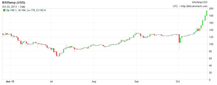 After the Bitcoin frenzy in spring, a few days ago the Bitcoin managed to overcome the 135 USD resistance that had built up over the course of several months. It surged upwards, in its own temperamental fashion, and has now passed 190 USD. Last year’s high of 260 USD is still a long way off, but it could be reached quickly at this pace. Why is this happening precisely now? I think there are two main reasons.