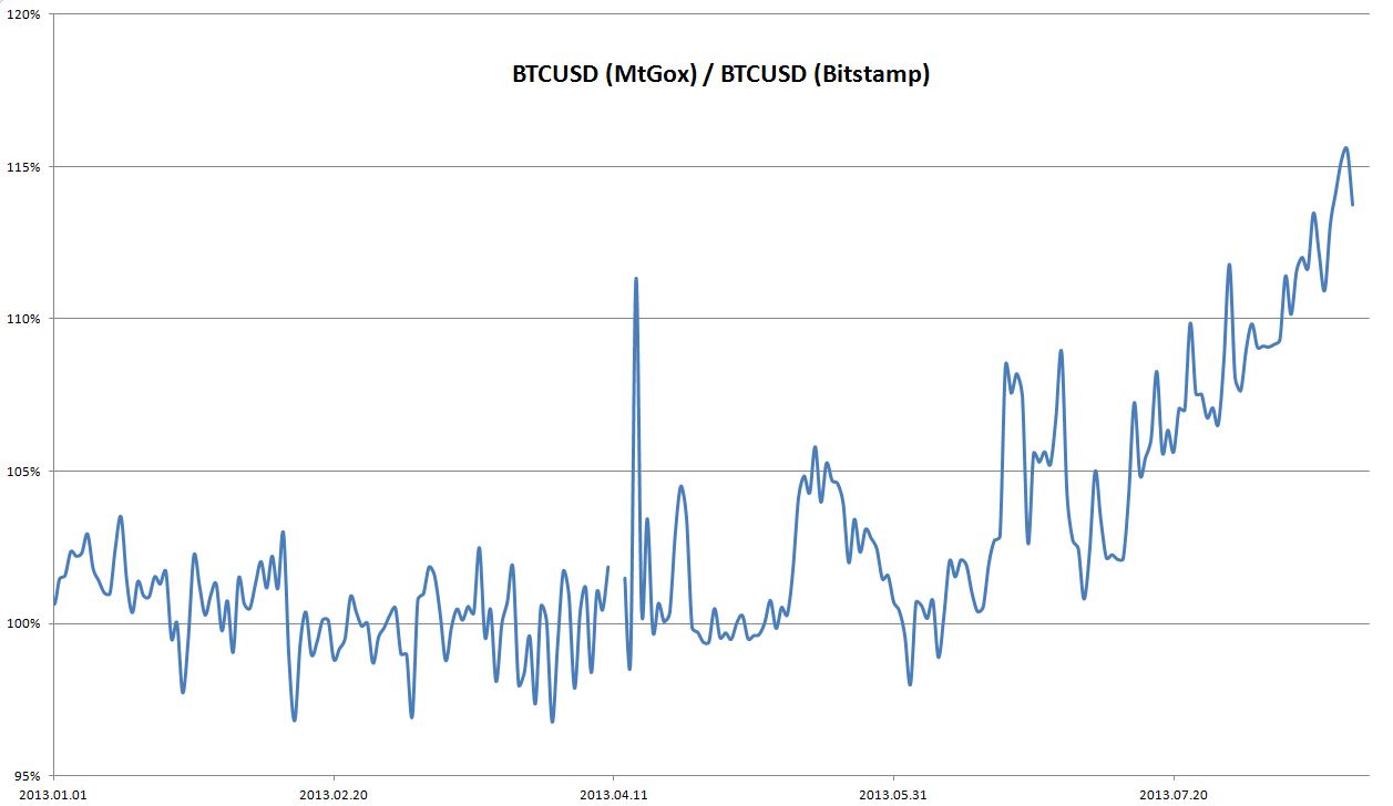 The Bitcoin price on the exchange with the largest volume, Mt. Gox, now exceeds by 15% the price on the second largest exchange (Bitstamp). Since these online marketplaces are far from perfect, and are slow, expensive and unreliable compared to traditional, supervised exchanges, there have been pricing differences of a few percent in the past too. However, a few weeks ago the spread began to increase and now it is incredibly large, as the figure below shows.