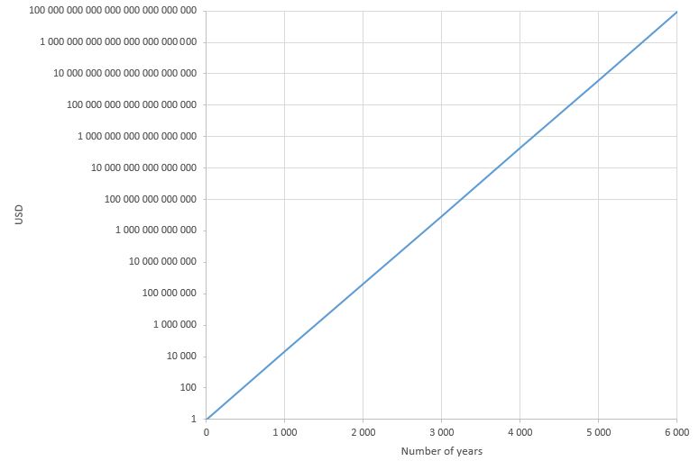 To answer the question, we must know the amount we want to pay in pensions. As I personally wish to secure a splendid retirement for the elderly, I suggest that each Hungarian pensioner should receive an annual income equivalent to the world’s current real GDP. At today’s rates, this is approximately $70,000 billion. To obtain the total amount paid on an annual basis, the figure obviously needs to be multiplied by the number of beneficiaries. Let’s assume the latter to be 3 million. At this point, this comes to $210 quintillion (210×1018). And as this should be paid from the interests of the accumulated amount, an assumption should also be made about the average real interest rate. Let’s assume the rate to be 1 percent. Based on historical data, this appears to be a rather conservative and easily viable estimate. That is, an amount corresponding to a total of $21 sextillion (21×1021) should be made out of the initial single dollar.